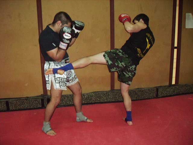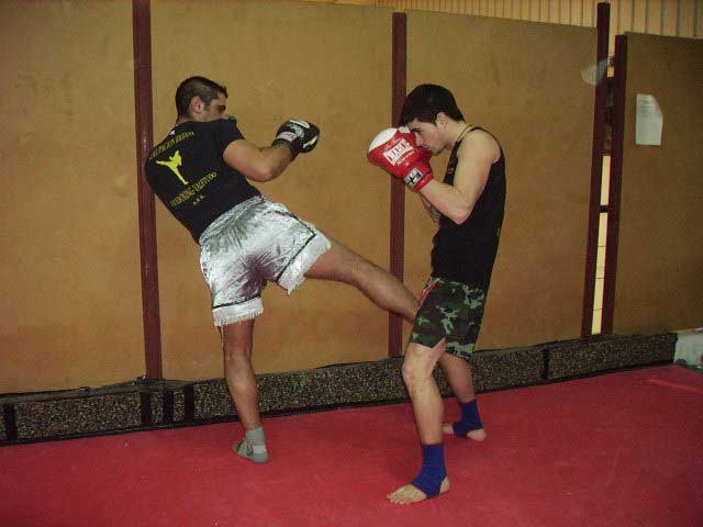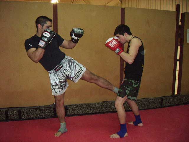 02.- Aguantamos el lowkick al muslo (en la foto sale al costado, vale para los dos)